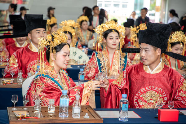 总说明 | 2025年5月18日晚以“长江之恋 缘定今生”为主题 的首届(2025)中国宜宾五粮液和美婚典活动在宜宾合江门广场举行。来自五湖四海的52对新人身着华服,在司仪的引导下,一步步沉浸式体验宋制婚嫁仪式,共同翻开人生幸福新篇章。 |