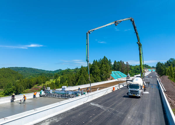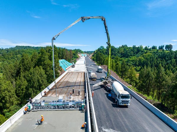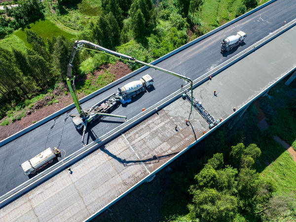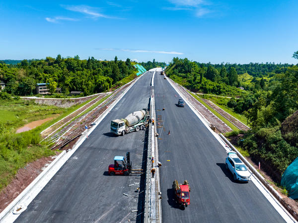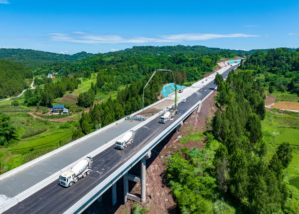 单说明 | 2025年7月23日,工人和机械在镇(巴)广(安)高速公路广安市广安区肖溪镇境内中滩关2号桥进行桥面铺装。 |