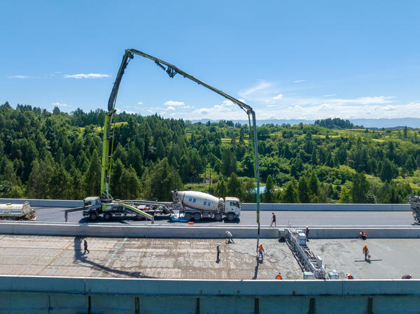 单说明 | 2025年7月23日,工人和机械在镇(巴)广(安)高速公路广安市广安区肖溪镇境内中滩关2号桥进行桥面铺装。 |