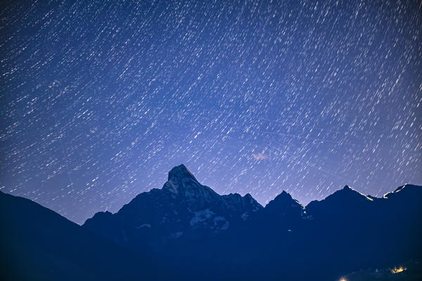 总说明 | 2025年7月27日,四川省阿坝州小金县猫鼻梁,当夜幕降临,海拔6250米的四姑娘山褪去白日的喧嚣,化身为银河倾泻的天然画布,星空流淌在湛蓝深空中,格外壮观。 |