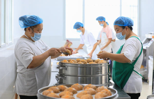 单说明 | 8月6日,宜宾市南溪区裴石镇小微产业园阮小小食品帮扶车间,工人们正加紧生产银丝卷、甜浆粑、包子等产品供应市场。 |