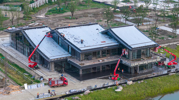 单说明 | 2025年8月26日,成都市郫都区郫筒街道望丛文化园项目正加快建设,现场许多工人和工程设备忙碌不停,一片繁忙景象。 |