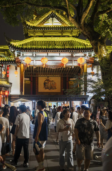 2025年8月23日,夏日的成都锦里,人来人往的游客络绎不绝地在景区内游玩与闲逛,景区展现出欣欣繁荣与热闹的景象。