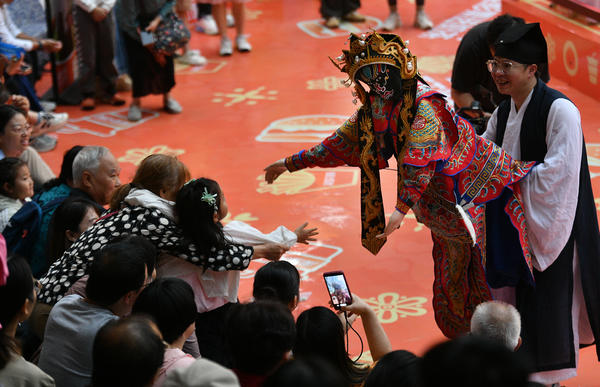 单说明 | 10月1日国庆节,成都东门码头上游客在观看非遗展演。 |