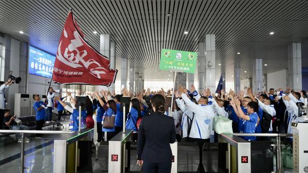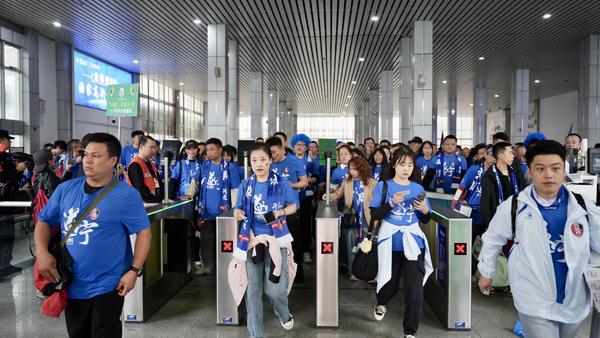 单说明 | 遂宁火车站喊声阵阵,约1100余名球迷整队集合,有序搭乘球迷专列前往达州,为遂宁队加油助威 |