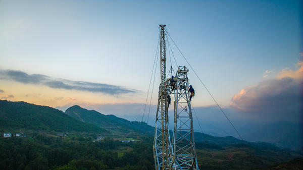 单说明 | 2025年10月23日,夕阳下,国网四川凉山供电公司工作人员正在凉山州普格县特兹乡建昌换流站(500千伏变电站)220千伏配套工程施工现场进行组塔作业。 |