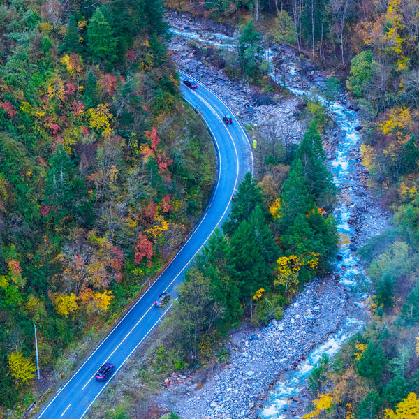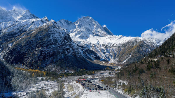 单说明 | 2025年11月4日至5日,阿坝州理小路在经历一周阴雪天后,迎来明媚阳光,壮丽雪山美景尽显,让游客大饱眼福。图为阳光下理小路上行驶的汽车。 |
