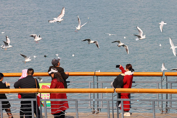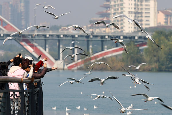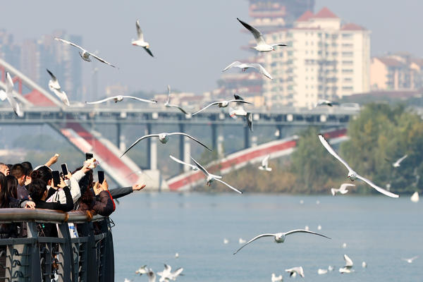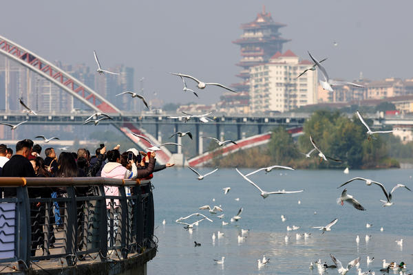 单说明 | 2025年11月27日,四川绵阳市涪城区三江湖码头,上千只红嘴鸥在碧波之上翩跹起舞,与前来游玩的游客暖心互动,成为冬日里最动人的生态图景。 |