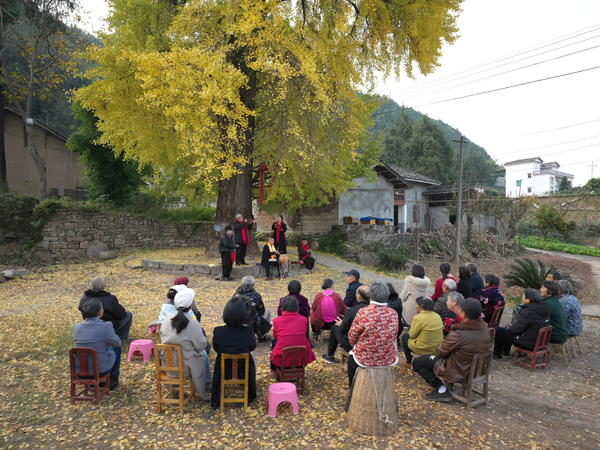 单说明 | 2025年11月28日下午,在阆中市思依镇北门社区,当地村民在千年古银杏树下开展川剧座唱、红歌联唱等文娱节目表演。 |