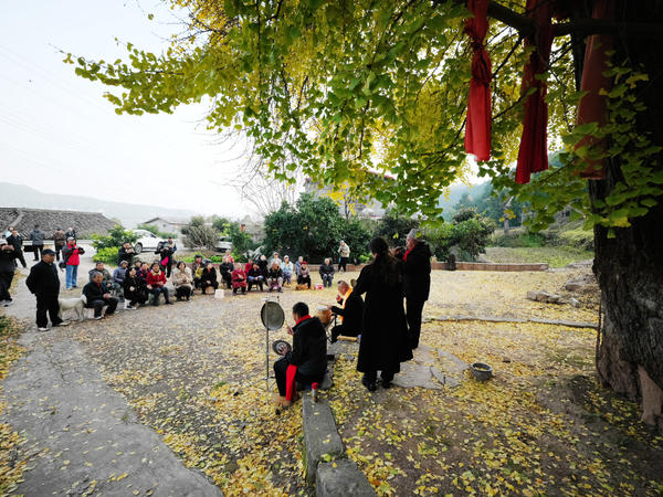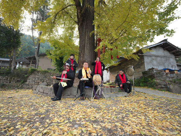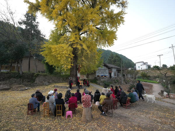 单说明 | 2025年11月28日下午,在阆中市思依镇北门社区,当地村民在千年古银杏树下开展川剧座唱、红歌联唱等文娱节目表演。 |