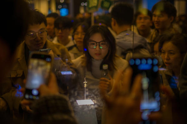 单说明 | 11月29日,在四川广汉三星堆博物馆,大量游客欣赏或用手机拍摄镇馆之宝之一的青铜神树。该青铜神树通高3.96米,是中国迄今发现最大的单件青铜文物,由底座、树和龙三部分组成,底座呈穹窿形,树干分三层,每层三枝 |
