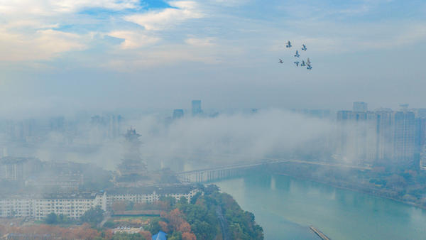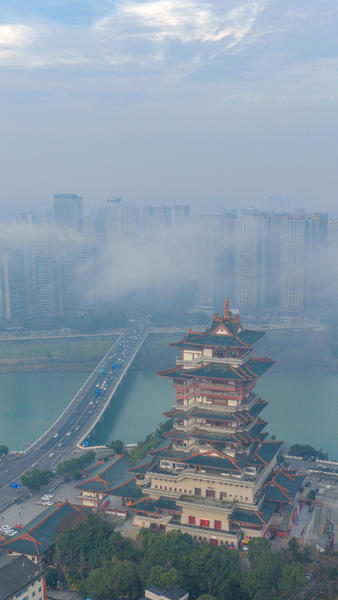 单说明 | 2026年1月4日早上,绵阳城区涪江上空飘着层层薄雾,越王楼在朝霞与云雾中若隐若现,美不胜收。 |