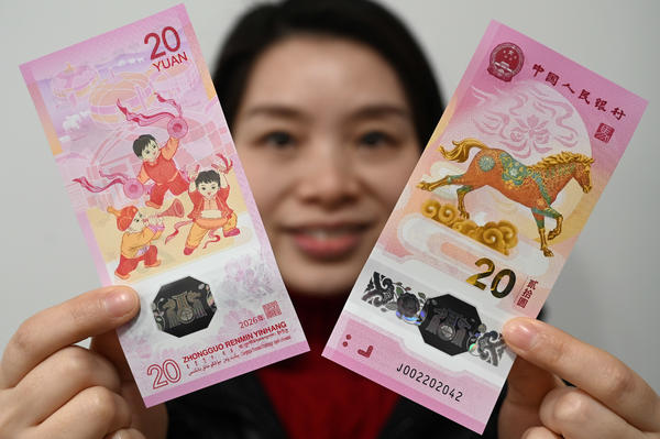 总说明 | 2026年1月20日,在内江市东兴区,市民正在展示刚兑换到的2026年贺岁纪念钞。 当日,中国人民银行发行的2026年贺岁纪念钞和双色铜合金纪念币开始兑换。其中,贺岁纪念钞面额为20元,采用塑料材质,发行数量为1亿张。贺岁双色铜合金纪念币面额为10元,发行数量为1亿枚。纪念钞和纪念币与现行流通人民币职能相同,与同面额人民币等值流通。 2026年贺岁纪念钞正面主景为马的造型图案,上方为中华人民共和国国徽、“中国人民银行”、篆书“马”字印章,下方依次为光彩光变面额数字“20”与汉字“贰拾圆”、动感全息图案、透明视窗、盲文面额标记和冠字号码。背面主景为儿童欢庆锣鼓图案,辅以蒙古包装饰图案,上方为面额数字“20”、汉语拼音字母“YUAN”,下方为花卉与动感全息图案、年号“2026年”、行长章、面额数字“20”、“中国人民银行”汉语拼音和蒙、藏、维、壮四种民族文字的“中国人民银行贰拾圆”字样。 2026年贺岁双色铜合金纪念币正面图案为“中国人民银行”、“10元”字样,汉语拼音字母“SHIYUAN”及年号“2026”,底纹衬以团花图案。背面图案为中国传统剪纸艺术与装饰年画元素相结合的马形象,衬以花灯和萱草图案,币面左侧刊“丙午”字样。 |