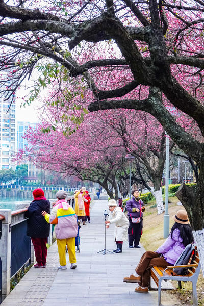 单说明 | 2026年1月21日,成都市武都路府河边,沿岸的红梅竞相绽放,树下不时有行人走过,还有市民在树下下象棋。 |