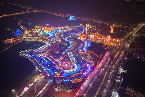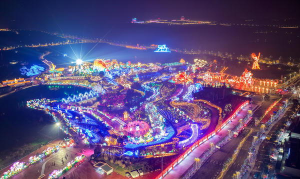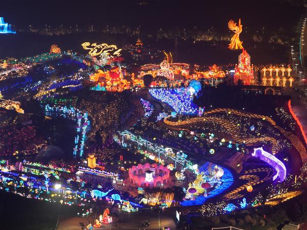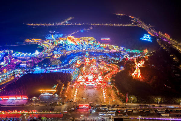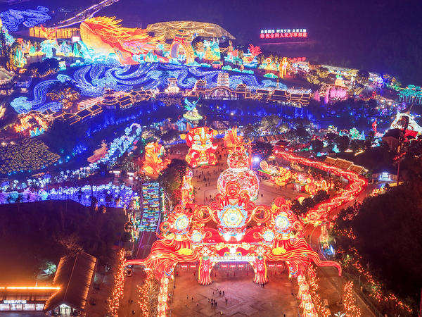 单说明 | 2026年1月23日晚,第32届自贡国际恐龙灯会在自贡市大安区大山铺镇中华彩灯大世界正式亮灯。鸟瞰灯会现场灯火璀璨,夜色迷人。 |