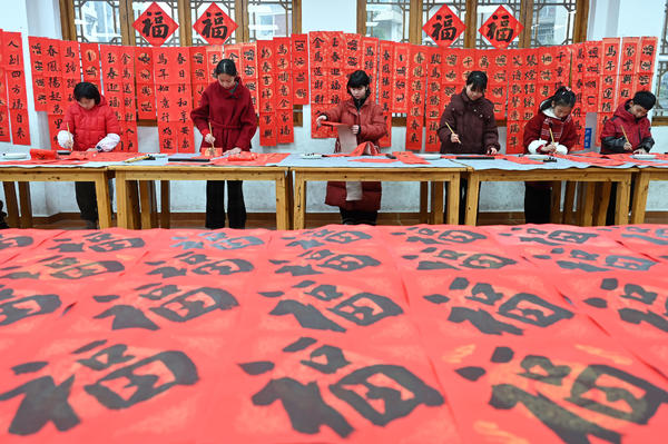 单说明 | 2026年1月29日,在内江市东兴区东兴老街,小学生们正在为社区居民书写春联和“福”字。 |
