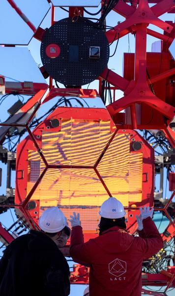 总说明 | 2026年1月26日晚,月光洒在甘孜州稻城县海子山上,在国家重大科技基础设施高海拔宇宙线观测站(LHAASO,拉索)内,一台高约14 米、口径 6 米的成像大气切伦科夫望远镜转向星空,对准千年前古人记录的超新星遗迹 —— 蟹状星云方向开始缓慢转动。“今天是第一台LACT 望远镜(也是工程样机)安装后的首次对天观测,我们将这台高灵敏度的望远镜直接瞄准宇宙线的一个候选源天体进行观测,这在天文学上叫望远镜的首光。” 一同见证这一时刻的中国科学院院士、“拉索” 首席科学家曹臻现场表示,“这也是这台给宇宙拍照的高清‘相机’的首秀。”当晚,随着望远镜持续工作,它成功捕捉到多个来自蟹状星云的宇宙线信号,而这些信号早在 6500 多年前就已发出。宇宙线是来自外太空的带电粒子,携带着宇宙起源、天体演化、太阳活动、宇宙空间环境等重要科学信息,其起源是当代天体物理学最重大的前沿科学问题之一。自2021 年起,“拉索” 便在海子山致力于破解宇宙线起源的世纪之谜,但在角分辨率方面存在制约,未能更清晰地观测天体。2024 年 9 月,四川省发展和改革委员会批复大型超高能伽马源立体跟踪装置(LACT)立项,该项目由 32 台 6 米口径的成像大气切伦科夫望远镜组成,布局于 “拉索” 阵列内部。2028 年项目建成后,将成为全球灵敏度和空间分辨率综合能力最强的超高能伽马源立体跟踪观测装置。“我们的望远镜,就好比一台高性能‘相机’对准天体观测,” 中国科学院高能物理研究所副研究员王玉东介绍,它的拍摄记录速度快,一帧“照片”仅有几十纳秒,捕捉宇宙线引发的簇射粒子在大气中发出的切伦科夫光,给这一场粒子“阵雨”拍一张完整的照片;未来通过多台望远镜从不同角度拍出其立体照片,就能更精确定位发出超高能伽马射线的天体,揭示其辐射本质。目前投用的工程样机,于 2025 年 1 月在成都组装测试,2026 年 1 月在 “拉索” 安装并投入使用。从望远镜的设计、制作到安装、调试,均由项目组年轻科研人员独立完成。他们发扬 “海子山” 精神,克服高海拔、恶劣环境等困境,将科学精神在高原上接续传承。望远镜上各个部件的研制都是经过反复论证、精益求精。例如反射镜的研制,项目组科研人员不厌其烦地进行了上百次试验,最终在国内首次研制成功新型复合材料反射镜,实现了质量更轻、加工效率更高和成本更低的反射镜,其性能指标达到国际先进水平,部分指标甚至超过国外同类产品。基于首台工程样机开展的多项测试数据,项目组完成了LACT望远镜的设计优化与定型。28日,第二台望远镜(即定型件)在天府宇宙线研究中心安装,开展关键的性能测试确认,之后将启动量产。预计 2026 年完成 4 台望远镜的制作与安装,投入运行后有望产生重大科学成果的观测数据。 |