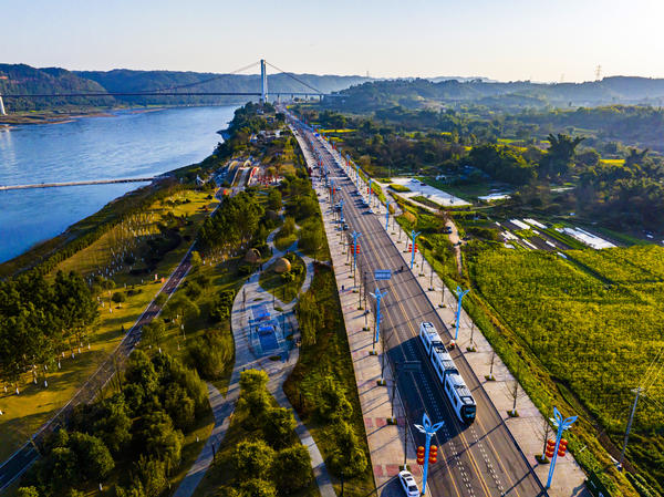 单说明 | 2023年6月12日,在宜宾市三江新区(临港经济技术开发区)营运的智轨T1线。 |