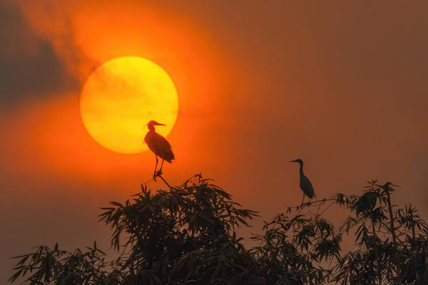 2026年2月5日,望江楼公园里忙碌一天的白鹭,在夕阳下成群结队纷纷归巢。