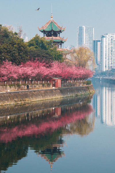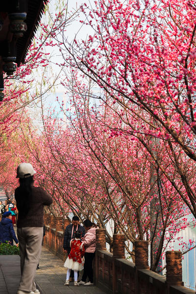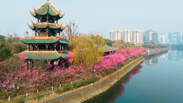 2026年2月5日,成都市望江楼公园的梅花迎来盛花期。粉白花朵缀满枝头,与崇丽阁古建、婆娑竹影交相辉映。众多市民游客或徜徉花间,或在梅树下泡一碗盖碗茶,尽享成都闲适生活。