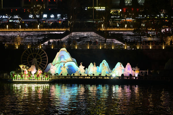 2026年2月13日晚上,“客来阆中”环型江上实景演出在南充市阆中古城嘉陵江边浓重演出。众多游客纷纷登上游船,在船上近距离观看演出。