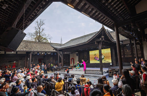 2026年2月22日,成都市青白江区城厢古城,市民游客观看川剧表演。