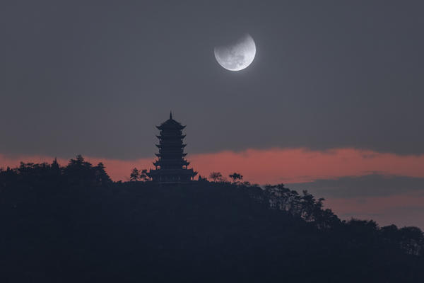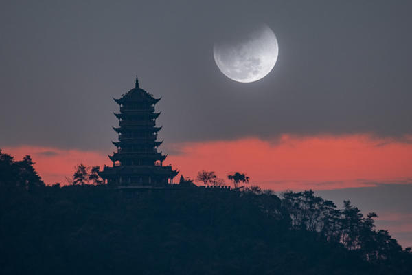 2026年3月3日马年元宵节,四川省成都市都江堰幸福镇看月全食。