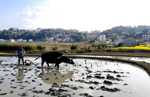 单说明 | 3月4日下午,南充市南部县石河镇玉台观村村民在翻耕水田。 |