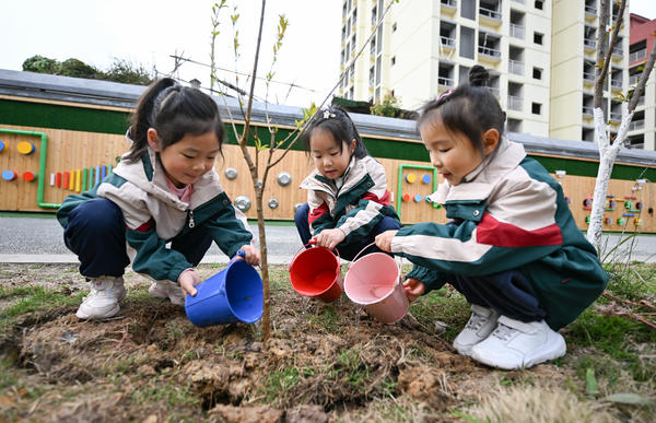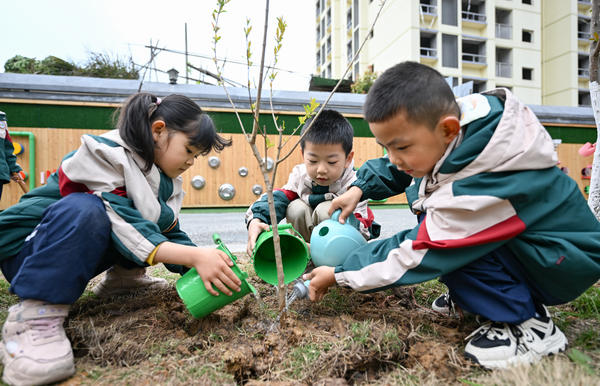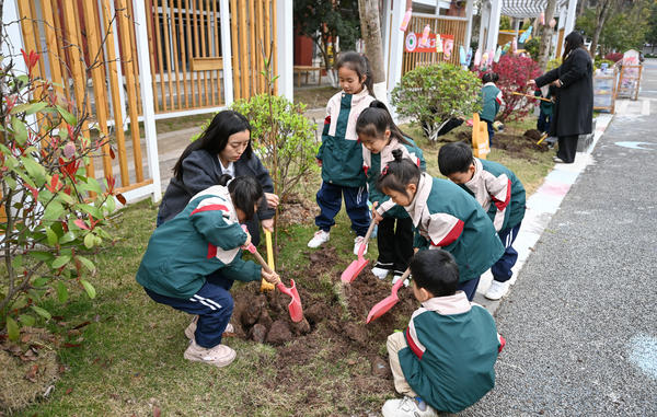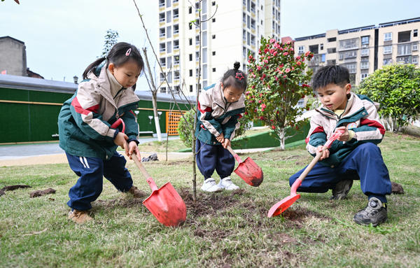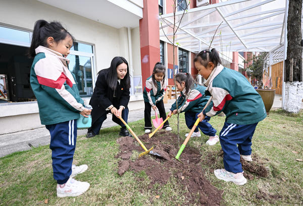 3月12日,岳池县滨河东路幼儿园组织孩子们在园内开展植树活动。小朋友们在老师指导下,分组进行扶苗、填土、浇水,在实践中体验劳动乐趣,为校园增添新绿。