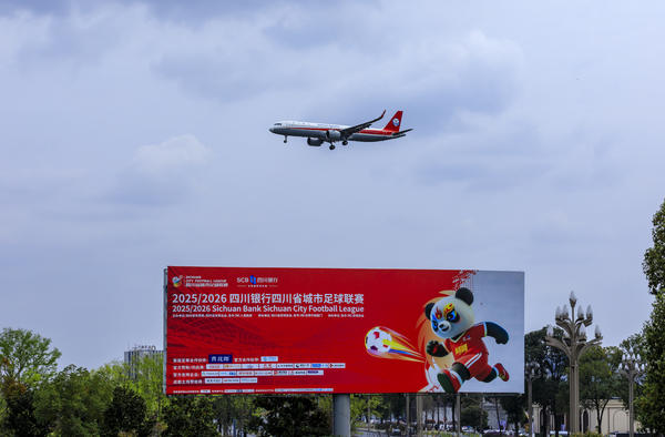 2026年3月15日,成都双流区环港绿洲,川航飞机与中超联赛广告牌同框。3月21日,成都主场赛事将在双流体育中心举行。