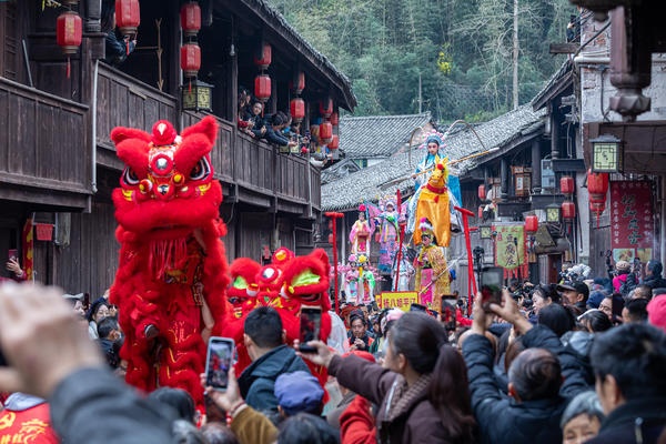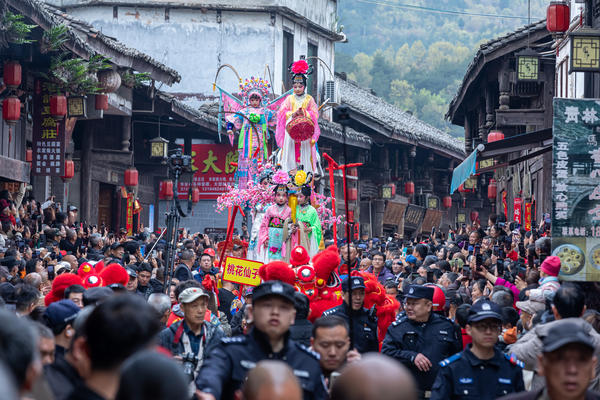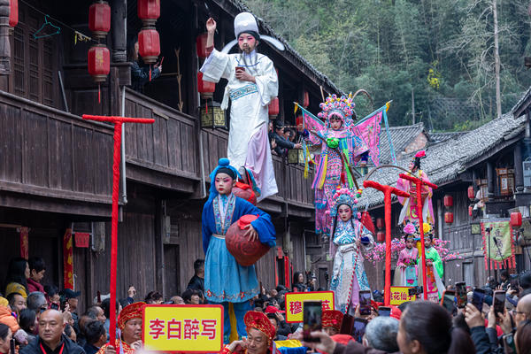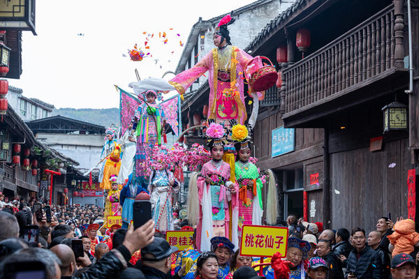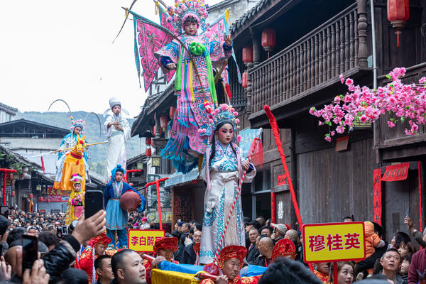 单说明 | 2026年3月19日,绵阳江油青林口古镇桃花会隆重开幕,国家级非遗高抬戏惊艳亮相,传统民俗为桃花盛会添彩。 |