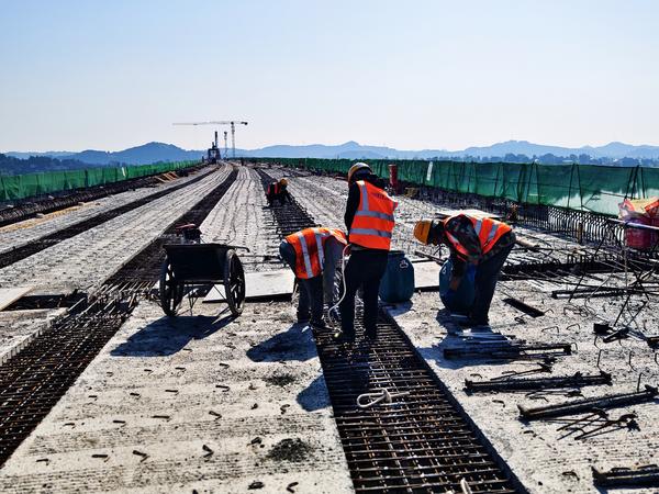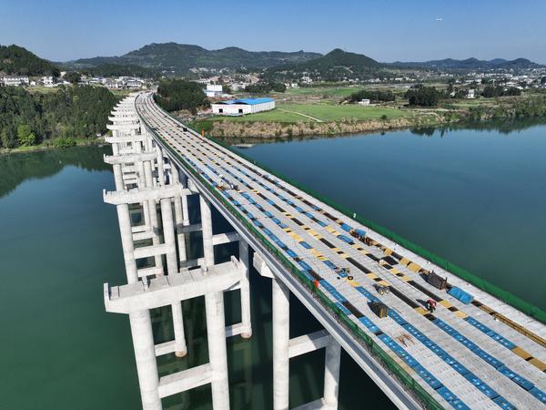 单说明 | 2026年3月26日,南充阆中市彭城镇界碑村,由中铁建大桥工程局承建的阆(中)营(山)高速公路嘉陵江特大桥建设现场,工人进行桥面铺设施工。 |