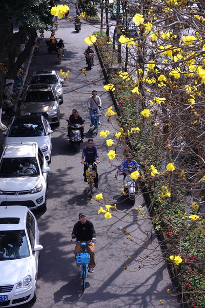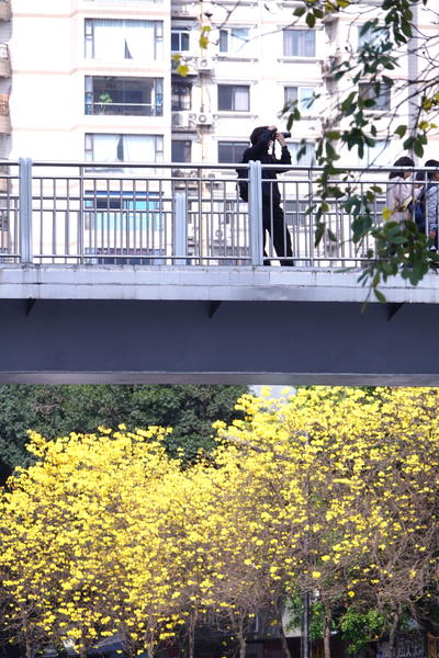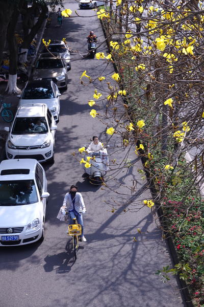 成都浆洗街。这里的黄花风铃木已进入盛花期,吸引了不少的游客前来打卡拍照。