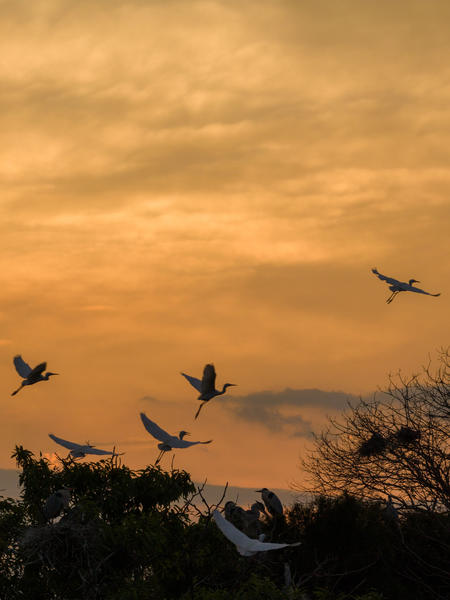 总说明 | 3月26日,绵阳涪城区杨家镇柏林湾村千鹤桑田主题公园的苍鹭/白鹤在朝阳下、晨雾里筑巢嬉戏,一派生机盎然,3月20日,鸟儿结束一天忙碌,有的朝着霞光深处飞去,有的栖落枝头。 据了解,该地最早从2018年开始有少量苍鹭(十几只)来此筑巢 ,现在已发展到2000—3000只左右白鹤,以苍鹭为主,含少量白鹭, 每年春季(3—4月) 来此繁殖,冬季部分留居 。 据悉,该地生态环境好,森林覆盖率超45%,桑田+水库+水塘密布,水质清澈、鱼虾多,食物充足 ;气候适宜,适合鹭鸟繁殖与越冬;另外,人为干扰少:园区安静、远离闹市,村民与政府保护意识强,不驱赶、不捕猎。 |