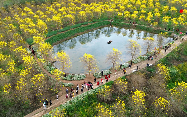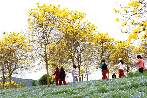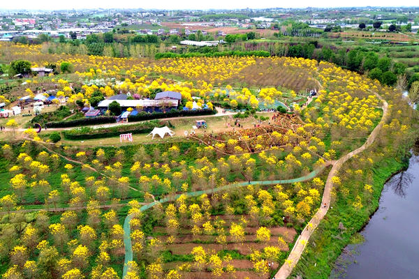 总说明 | 2026年3月30日,临近清明假期和春假,成都市金堂县赵家镇“金色春谷”的4万余株黄花风铃木率先为成都带来第一抹金黄。 “金色春谷”以赏花为主导,打造集摄影打卡、现代亲子自然项目、农作物种植及采收、乡村休闲等于一体的复合型产业,园区设置餐饮休闲、棋牌娱乐、露营打卡等消费场景,满足不同人群的多样化消费需求。 |
