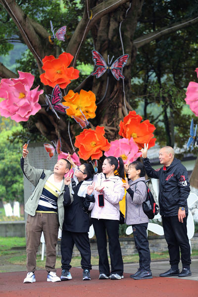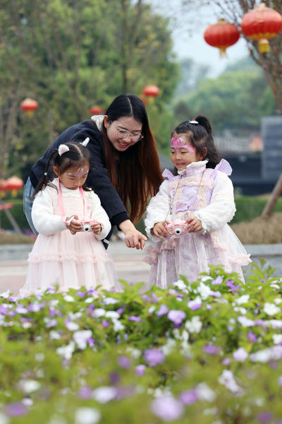 2026年4月3日,游客在四川省乐山大佛景区莲花广场游玩。