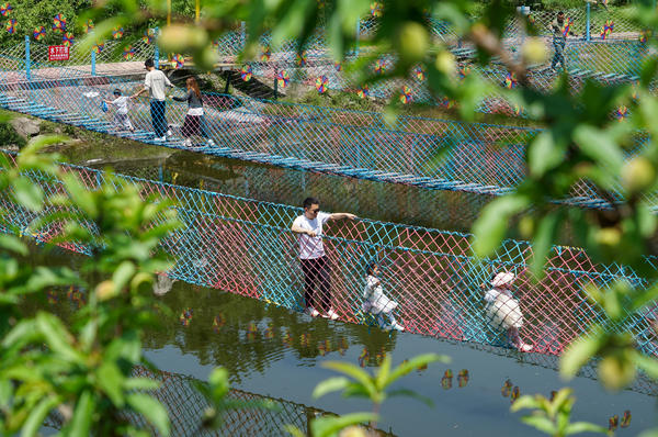 总说明 | 2026年4月25日,巴中经开区天池部落景区内,家长带着孩子在网红吊桥上体验游玩,乐享春日周末时光。近年来,巴中依托城市近郊资源,打造了一批兼具趣味性与体验感的乡村文旅项目,为市民提供了丰富的就近休闲选择。 |